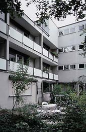Während die zur Strasse hin verdeckte, auf Grund der Hanglage vom Garten her jedoch als Vollgeschoss erkennbare Basisebene ursprünglich Gemeinschaftseinrichtungen sowie Wirtschafts- und Kellerräume beherbergte, waren die Geschosse darüber dem Wohnen vorbehalten. Die Kleinwohnungen des Strassenflügels bestanden aus einem Wohn- und einem schmaleren Schlafbereich, die je nach Belieben mit Hilfe einer Schiebewand getrennt oder verbunden werden konnten; die Wohnungen an der südlichen Gebäudestirn waren um ein zum Hof ausgerichtetes Zimmer erweitert.
