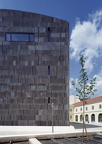 Eine 10 Meter breite Freitreppe führt zur Eingangsebene 4 m über dem Hofniveau. Im Inneren teilt eine von oben belichtete Halle das Museum über alle Geschoße in zwei unterschiedlich proportionierte Raumgruppen. Die Eingangsebene befindet sich höhenmässig in der Mitte des Gebäudes. Zwei Hauptausstellungsebenen liegen darüber, zwei darunter, ein weiteres Untergeschoß wird für Depots und Haustechnik genutzt. Auf der einen Seite der Erschließungshalle 5, ca. 700 m² grosse und 5 m hohe, stützenfreie Ausstellungsebenen, übereinander gestapelt, flexibel unterteilbar. Auf der anderen Seite intimere „Kabinette“, 3,50 m hoch und je 250 m² gross. Dazwischen liegen, frei in die 35 m hohe Halle gestellt, die Personenliftgruppe sowie der Lastenlift. Stege verbinden die unterschiedlichen Ebenen. Direkt am Foyer liegt die erste grosse Ausstellungsebene, der Shop und - im Zwischengeschoß am Übergang zum Altbau (Spange)- das Café. Der separat bespielbare Veranstaltungsbereich liegt unter der Freitreppe.