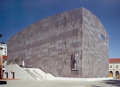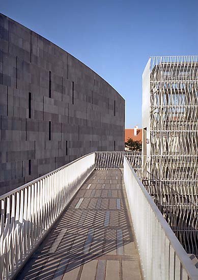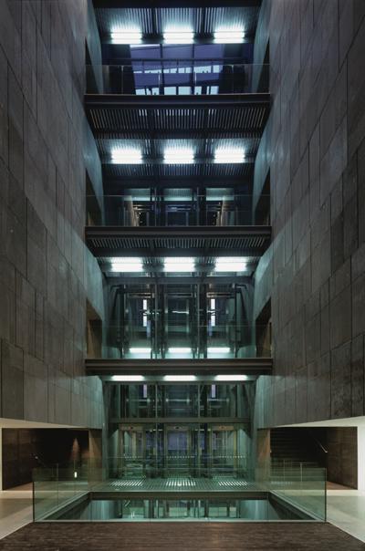 Die Museumsräume beschränken sich in ihrer architektonischen Ausformung auf grosszügige Reduktion. Sie verfügen über ein differenziertes und flexibles Kunstlichtsystem. Der oberste Ausstellungsraum bekommt Tageslicht über eine grosse Aussparung in der gekrümmten Decke. Die übrigen schlitzartigen Öffnungen sowie das Panoramafenster im obersten Geschoß dienen als Ausblicke und zur Orientierung. (01.10.2001)