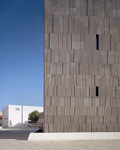 Von außen erscheint das Gebäude als dunkler, geschlossener Block, das gekrümmte Dach an den Ecken weit nach unten gezogen; monolithisch in anthrazitgrauem Basaltlava an Fassaden und Dachflächen. Der Baukörper ist deutlich vom angrenzenden Niveau abgesetzt und scheint aus der Tiefe aufzutauchen.