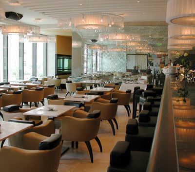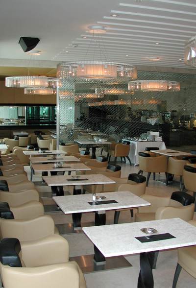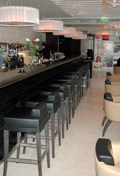 Den Hauptraum, dessen Wände – ebenso wie die gesamte „Aussenhaut“ des Hauses – mit hellem Muschelkalk verkleidet sind, dominiert die schlanke Bar aus Eichenholz, die sich fast über die gesamte Längsseite erstreckt. Ein weiterer Blickfang ist die spiegelverglaste Wand gegenüber der Eingangszone, die dem Lokal eine magische Tiefe verleiht. Markante Leuchtobjekte an der Decke in Verbindung mit den Tischen und den lederbezogenen Stühlen (allesamt Hareiter-Entwürfe) nehmen auf die unterschiedlichen Anforderungen Bedacht und verleihen dem Café Leopold eine elegante Atmosphäre.