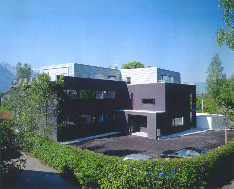 Man glaubt es kaum, was da ein wenig abgerückt von der Moosstraße steht: ein scharfkantiger, aus versetzten Kuben und Quadern gebildeter Baukörper, dessen schwarzes Mauerwerk in der Sonne irritierend flimmert und glitzert. Die weißen Begrenzungsmauern zweier uneinsehbarer räumlicher Einheiten setzen sich davon ab und geben keinen Aufschluß darüber, was sich dahinter verbirgt: Mülltonnen? Geparkte Autos? Ganz oben schimmern die Blechpaneele an der Fassade des neu hinzugekommenen Obergeschoßes, das wie ein Penthouse formuliert ist.