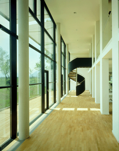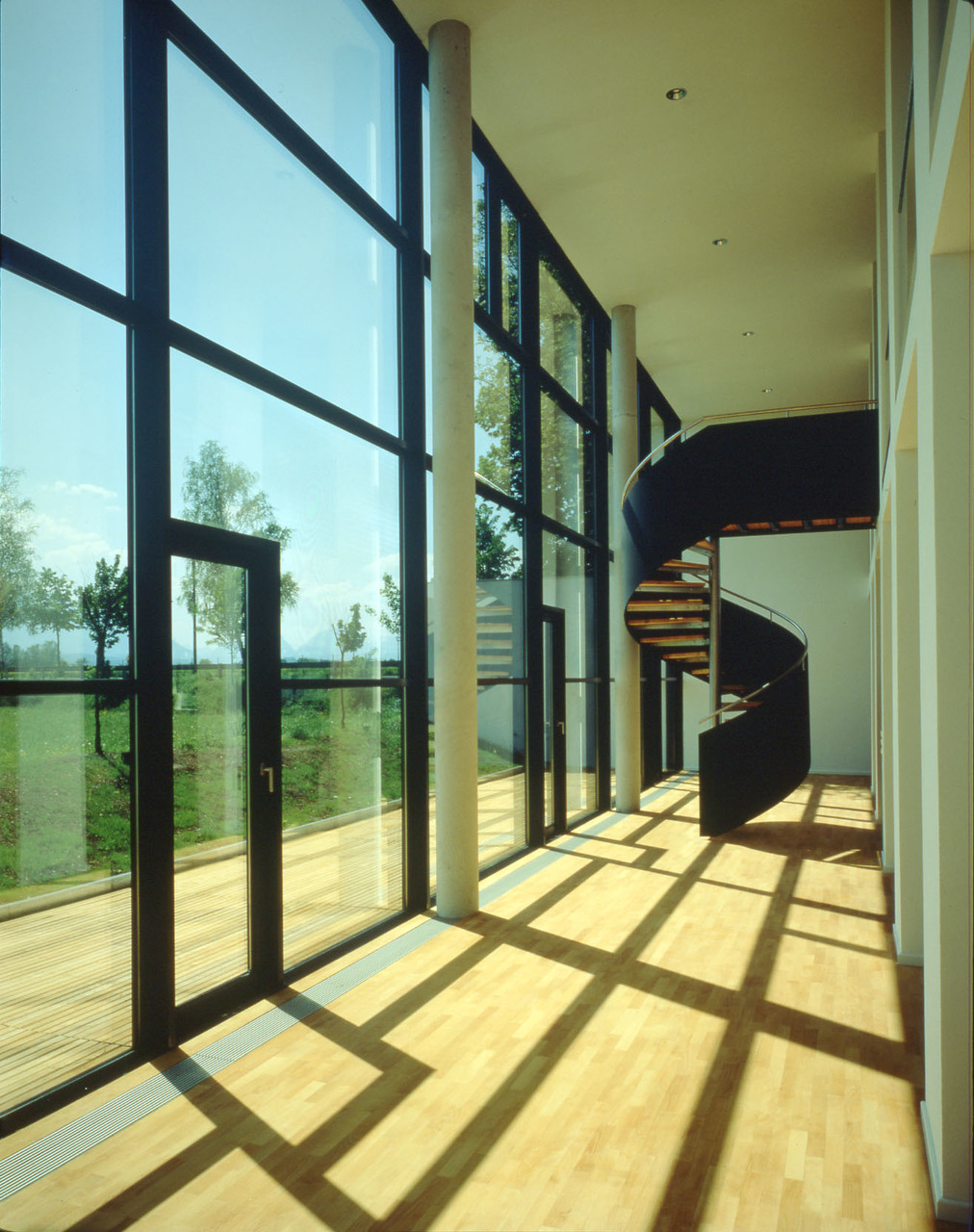 Apropos ideell: Wimmer konnte es sich nicht verkneifen, etwas bei diesem Projekt zu realisieren, was der Bauherr herkömmlichen Zuschnitts so gut wie immer rigoros verweigert. Er hat - wie soll man sagen: sinnlose?, nutzlose?, jedenfalls unverwertbare - Freibereiche geschaffen. Sie verbergen sich hinter den eingangs erwähnten weißen Umfassungsmauern und schließen nicht Mülltonnen oder Parkplätze ein, sondern im einen Fall die „natürliche“ Skulptur eines 30jährigen Nußbaumes, im andern die „künstliche“ eines von Francis Valentiny geschaffenen Bronzekopfes, der auf einem Podest plaziert ist.