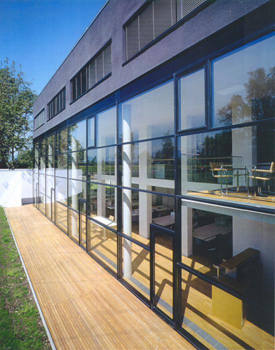 Die Glasfassade des Büros schaut also nach Süden. Sie ist selbstverständlich durch automatische Jalousien „abgesichert“, man erstickt oder verbrutzelt auch bei Sonne nicht in den Arbeitsräumen. Überhaupt ist das Büro räumlich so organisiert, daß alle erdenklichen funktionellen Kriterien bestens erfüllt sind.