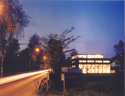 Salzburg, Moosstraße. Vorher: ein riesiges Satteldach, eine Laderampe. Nach Umbau, Sanierung und teilweisem Abriß unter der Ägide von Robert Wimmer: ein aus versetzten Kuben und Quadern gebildeter Baukörper, so scharfkantig wie funktional.