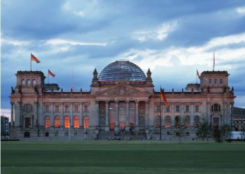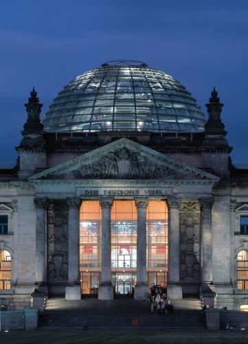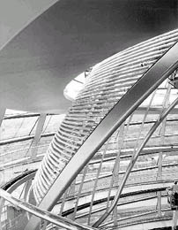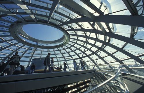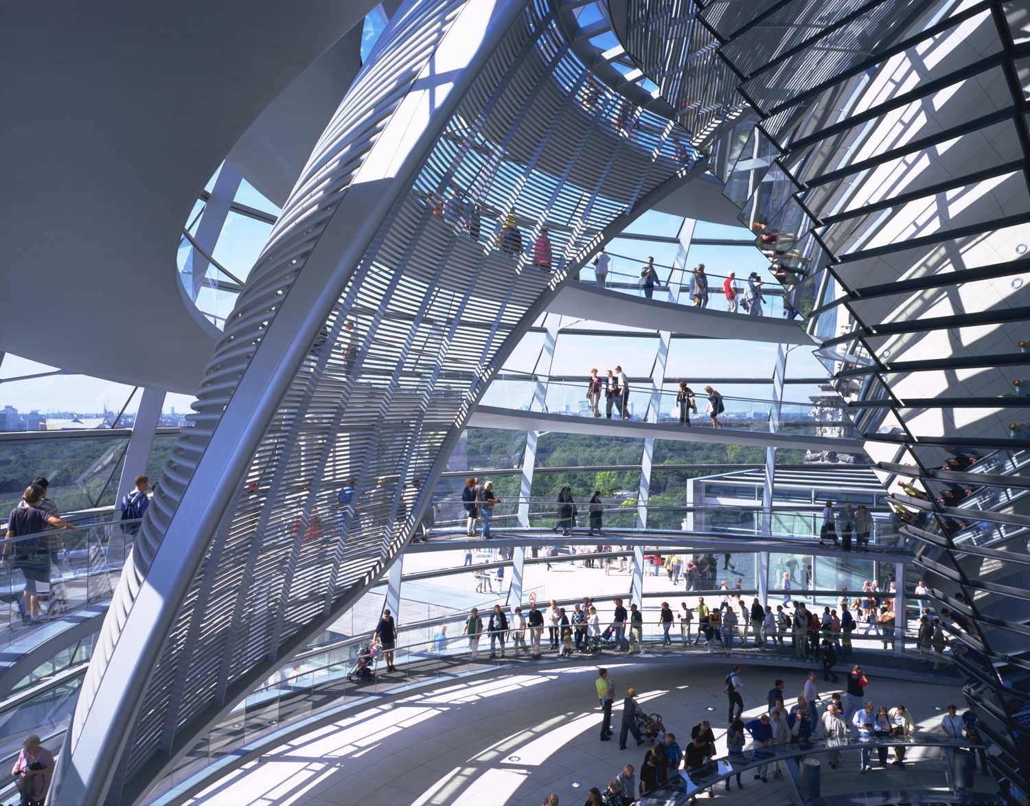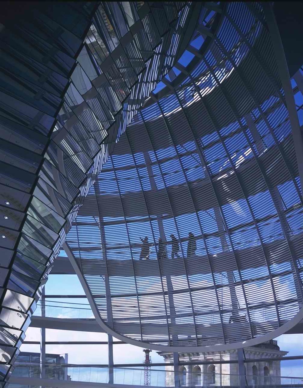 Zwölftausend Tonnen Stahl und Glas - das Reichstagsdach mit seiner Kuppel prägt nicht nur das Regierungsviertel Berlin-Tiergarten. Fosters Absicht war es, gerade hier weit sichtbar in die Stadtsilhouette hinein einen eigenen Akzent zu setzen. Wie eine Spirale schraubt sich die schwebende Fußgängerrampe in den Berliner Himmel: Sie führt in die Reichstagskuppel hinauf, die mit ihren dreißig Metern fast so hoch ist wie jene von 1894, die der Frankfurter Architekt Paul Wallot damals entworfen hatte. Die Haube eröffnet Ausblicke auf die deutsche Hauptstadt, und zu ihren Füßen bietet „Feinkost Käfer“ aus München Kulinarisches.
