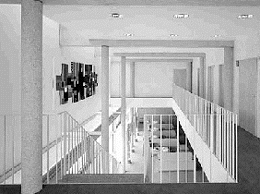Der Treppenlauf im doppelt hohen Raumteil führt in einen kleinen Mehrzwecksaal über dem Eingang, der von der Bank für allerlei Initiativen bis hin zu kleinen Ausstellungen genutzt werden kann. Eine schmale Galerie erschließt Dienst- und Nebenräume. Da das gesamte Gebäude als Montagebau errichtet wurde, besteht die Stahlbetonkonstruktion aus vorgefertigten Elementen, wobei die runden Stützen mit ihrer gestockten Oberfläche deren visuelle Schnelligkeit etwas verlangsamen. Die handwerkliche Bearbeitung verfremdet den Elementbaucharakter, der nun nicht mehr mit „billig“ gleichgesetzt wird.