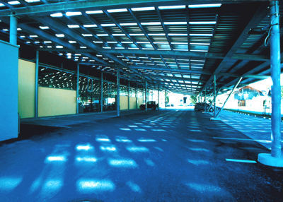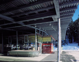 Die Interpretation dieser Richtwerte mit den Werkzeugen Gutmorgeths ergibt die 21 m stützenfrei überspannte, verglaste Schachtel, gehalten und beschirmt durch eine den Kräfteverlauf spiegelnde, extrem ökonomische Kaltdach-Konstruktion. Die Stahlfachwerksträger sind für Schneelasten von 750 kg/m2 ausgelegt. Die Weiterführung der Überdeckung über den Parkplatz erspart in den Wintermonaten die Schneeräumung, wo durch die nahen großen Ski-Orte der Markt mit Bankfiliale, Postamt, Café und Lottostelle am stärksten ausgelastet ist, und bietet im Sommer der Gemeinde und ihren vielfältigen Vereinen eine kostenlos beschattete Veranstaltungsfläche. (Text: Otto Kapfinger, 12.11.2001)