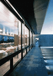 Obwohl prominent über dem Rebberg gelegen und eng mit dem historischen Komplex verflochten, ordnet sich der rechtwinklig zum Küchengebäude entlang der Nordsüdachse errichtete Restauranttrakt harmonisch ins Gesamtbild ein. Dieser als «verglaster Aussenraum unter einer schwebenden Dachplatte» konzipierte japanisch elegante Pavillon, der an milden Tagen fast ganz geöffnet werden kann, ist gleichsam die Neuinterpretation des australischen Verandahauses. Über eine Treppe erreicht man vom Rebberg her den Eingang. Ein Bassin, geteilt von einer Betonwand, bildet hier den neuen, an Mies van der Rohes Barcelona-Pavillon erinnernden Mittelpunkt der Gesamtanlage. Mit seiner Transparenz erzeugt das Restaurant einen reizvollen Kontrast zu den alten Bruchsteinbauten; und der mit eleganten Designermöbeln eingerichtete Speisesaal gewährt einen Panoramablick auf Stadt und Meer. Zwölf verchromte Stahlträger, auf denen das Metalldach ruht, und ein hölzerner, den Abgang zum Weinkeller markierender Buffeteinbau setzen hier die einzigen Akzente in einer Architektur, die ihre Qualität aus der Reduktion zu schöpfen weiss.
