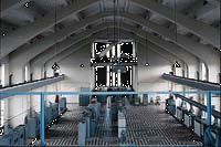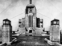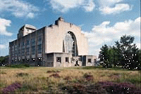 Etwas weiter nördlich davon liegt ein mächtiges und wenig bekanntes Gebäude, die Funkstation Kootwijk. Sie wurde zwischen 1919 und 1922 von dem in Amsterdam geborenen Architekten Julius Maria Luthman (1890-1973) errichtet. Eine einsame Strasse führt durch den Wald bis zur Grenze des abgesperrten Terrains. Hat man den Schlagbaum passiert, sieht man in der Ferne einen grauen, hochaufragenden Bau. Halb Bunker, halb Kathedrale, spiegelt sich die Front des aus Stahlbeton errichteten Bauwerks in einem vorgelagerten Wasserbecken, was den Eindruck von der Wucht des Baus nochmals verstärkt. «Radiostation» heisst es in Versalien über dem Eingangsportal; ein Relief des Bildhauers Hendrik Albert van den Eindje zeigt eine von zwei Figuren umgebene Maske mit geöffnetem Mund. Zeitgenossen sahen in der Maske den durch die Räume entsandten Fernruf, während die weiblichen Gestalten das Abendland und den kolonialen Osten repräsentieren.