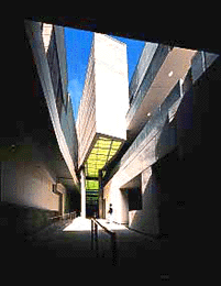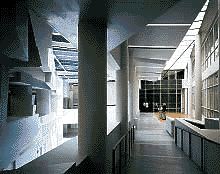 Den trichterförmig in die Stirnwand eingelassenen Haupteingang erreicht man über eine Freitreppe, die fast ein wenig mediterran anmutete, führte sie nicht über eine halboffene Tiefgarage. Von Brücken überquert, weitet sich der Innenraum zum Eingangsfoyer und zur Cafeteria und zieht sich dann - oft höhlenartig eng - wie ein zartfarbener Cañon über drei Geschosse hin. Die von einem labilen Ausgleich zwischen Chaos und Ordnung bestimmte, an Piranesi gemahnende Raumsequenz gibt Rätsel auf, vermag aber auch zu verunsichern.
