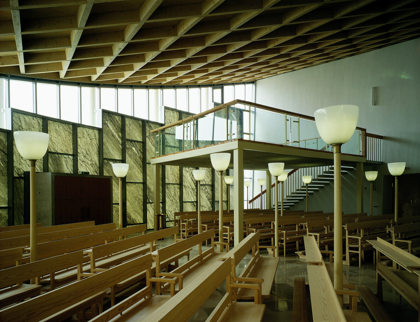 Es erwies sich als großer Vorzug, daß die Architekten auch die Ausstattung der Kirche entwerfen konnten und nicht auf Fertigprodukte zurückgreifen mußten. Im Fall der Beleuchtung war dieser Vorzug sogar höchst bedeutungsvoll. Denn irgendwelche abgehängten Lampen hätten die Wirkung der Holzdecke mit Sicherheit zerstört. So konnte man zu einer maßgeschneiderten Laternenlösung greifen, zu Leuchten, die aus dem Boden „herauswachsen“, sodaß die Großzügigkeit des Zeltdaches nicht durch eine zusätzliche horizontale Ebene beeinträchtigt wird.