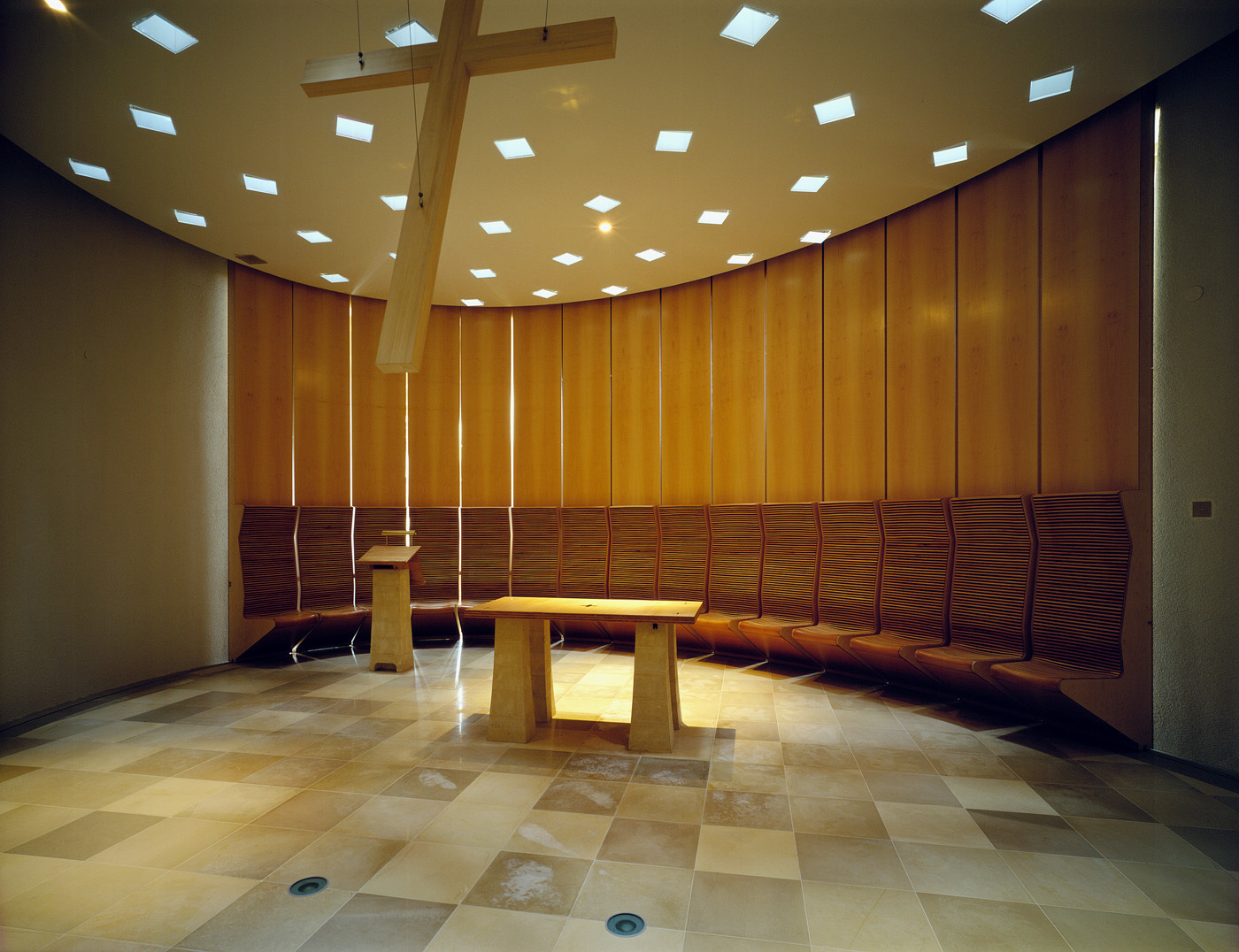 Ein Detail im Altarraum sollte man noch erwähnen: Hier fällt durch quadratische Plexiglasprismen Tageslicht ein. Wenn man im richtigen Winkel durch die 1,20-Meter-Prismen schaut, kann man sogar einen Blick auf den Glockenturm erhaschen. Diese Prismen sind in einem unregelmäßigen Muster in die Decke eingelassen - ein Ornament, das aber nicht beliebig ist. Denn es basiert auf einem Muster, das Albrecht Dürer aus Fünfecken und Rhomben entwickelt hat, wobei immer dort, wo der Rhombus sein sollte, das Glasprisma plaziert ist. - Konzeptuell nicht uninteressant: Der Altarraum wird durch wandhohe Sitzelemente begrenzt, die sich verschieben lassen, sodaß sich der Altarraum unversehens zur kleinen Werktagskapelle wandelt.
