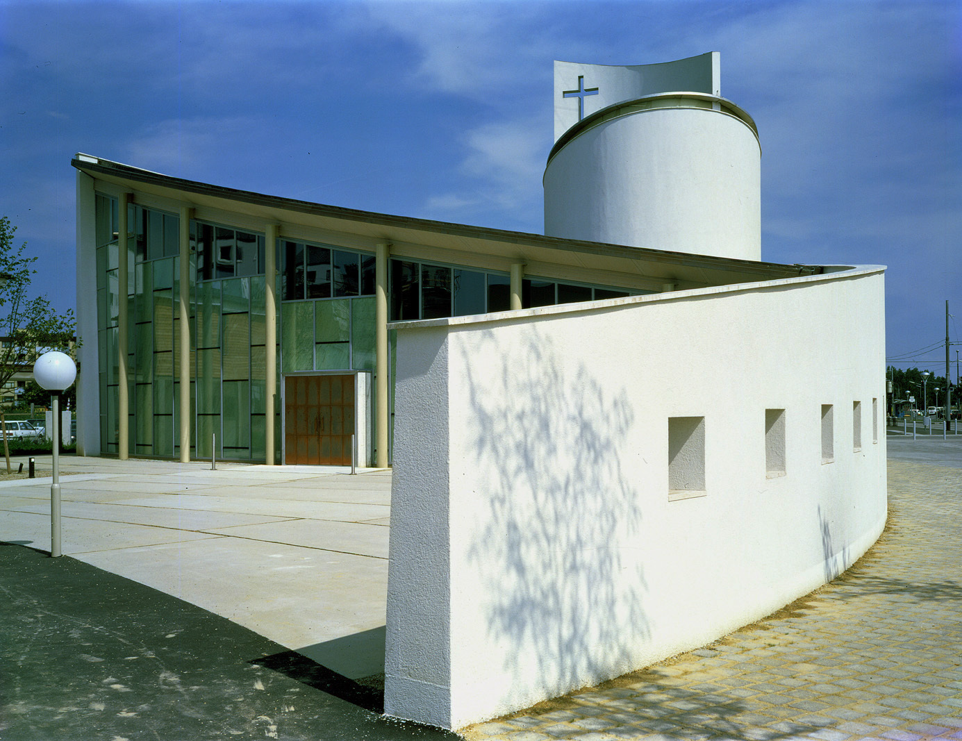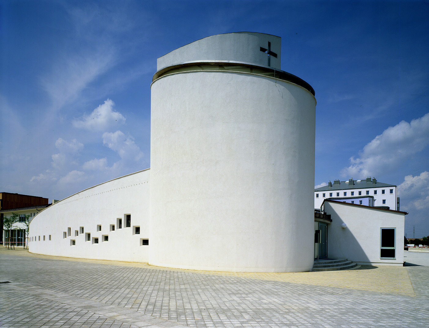 Von außen ist es vor allem die schwungvoll gekrümmte, von zweieinhalb auf acht Meter ansteigende Mauer, die diesem Pfarrzentrum Identität verleiht und im übrigen auch den Kirchenraum selbst definiert. Ihre Form leitet vom Kreisbogen in eine mathematische Parabel über, wobei im Scheitel der Parabel eine exakt nach Osten orientierte Ellipse herausgeschnitten wurde - dort befindet sich der Altarraum.