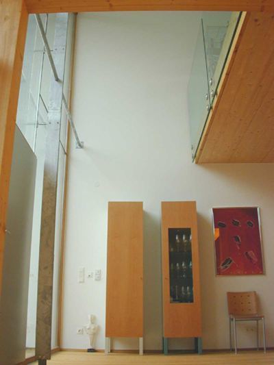 Ein zweigeschoßiger Fensterbogen umrandet die als Speichermasse dienende Betonskulptur der Treppe und suggeriert Einsehbarkeit. Die tatsächlichen Aufenthaltsbereiche wie der Esstisch im Erdgeschoß und die Leseecke auf einer Galerie darüber bleiben aber durch die Stiegenhauswand abgeschirmt.