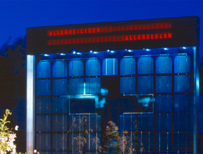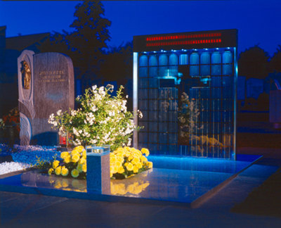 Ein automatisiertes „ewiges Licht“ lässt die Grabstätte auch ohne aufwendige Wartung stets gepflegt erscheinen, die Reflexion des (einen herkömmlichen „Stein“ ersetzenden) Solarmoduls in der Oberfläche der Grabplatte (geätztes Edelstahlblech) erzeugt eine subjektive Tiefenwahrnehmung. Die Solarzellen, die in ihrer Anordnung ein Kreuz umschreiben, und eine langlebige Blei-Gel-Batterie betreiben eine LCD-Anzeige, die mit wechselnden Gedenk-Texten bespielt und immer wieder neu programmiert werden kann. Das erleuchtete Wasser im kubischen Weihwasserkessel stimmt auf das Gedenken an den Toten ein, eine Öffnung in der Grabplatte gibt den Blick auf die darunterliegenden Erde frei, aus der wiederum neues Leben entsteht. Klassische Symbole - Erde, Wasser, Licht - wurden in eine zeitgemässe Formensprache übersetzt, mit der die Architekten das Ende der „Steinzeit“ bekunden. (Text: Gabriele Kaiser)