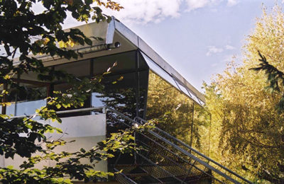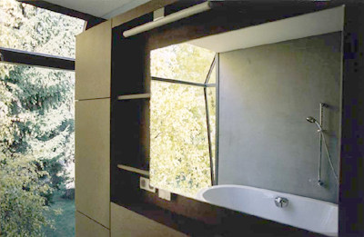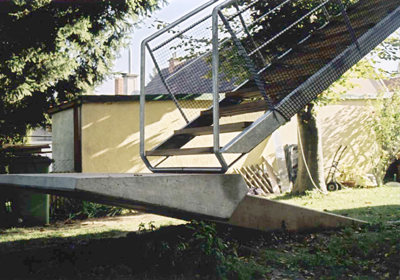 Die räumliche Klammer (Boden, Rückwand, Dach) besteht aus fünf vorgefertigten Teilen in Holzkonstruktion, wobei der Rücken zur Horizontalaussteifung mit vier Betonscheiben verstärkt und die drei übrigen Seiten auf einer schlanken Stahlkonstruktion vollflächig verglast wurden. Der statisch freigespielte Innenraum ist durch veränderbare Schrankwände (anthrazitfarbene MDF-Platten) und Schiebeelemente gegliedert, die dank oben geführter Glasbänder keine tektonische Schwere, sondern provisorische Wohnlichkeit ausstrahlen, so als könne man die räumlichen Gegenheiten mit wenigen Handgriffen jederzeit neuen Bedürfnissen anpassen. Der Neigungswinkel der grossen Gartenverglasung intensiviert die Wahrnehmung, (man blickt in Fichtenzweige und gen Himmel, nicht etwa in des Nachbarn Garten), zusätzlich öffnen Verbindungsgang, Vordach und Stiege den Lebensraum ins Freie.