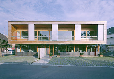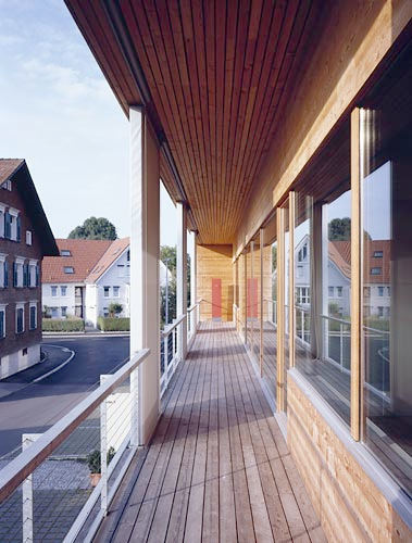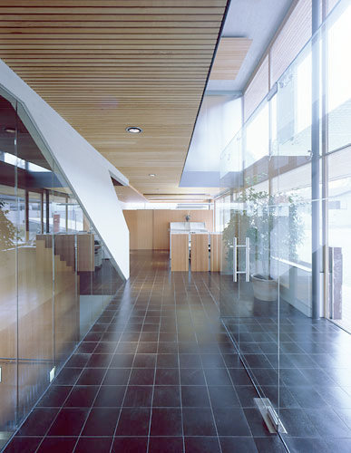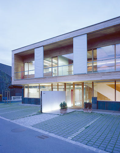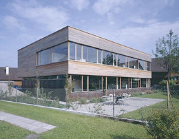 In der Kubatur korrespondiert das Bürohaus mit den Streuboxen der Umgebung, eine schräge Zufahrt schert in die südliche Flanke des Gebäudes, eine Betonscheibe markiert an der westlichen Längsseite das Entree. Die Grundrissstruktur zeigt sich gegenüber modischen Office-Konzepten resistent, Einzelbüros, Besprechungsräume sind auf beiden Ebenen um eine offene Mitte angeordnet, in der Materialität sorgen Glas und Holz für unspektakuläre Arbeitshintergründe, Transparenz ist ebenso ein Thema wie das Bedürfnis, in aller Ruhe und ungestört sein Tagwerk zu verrichten. Will man denn mehr? (Text: Gabriele Kaiser, 24.03.2003)
