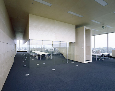 Sie hatten wirklich einen großartigen Bauherrn. Sonst wäre das sicher nicht gegangen. Man kommt in einen sehr niedrigen Empfangsbereich hinein - 2,60 Meter und weniger -, und als Besucher fährt man dann mit dem Lift ins oberste Geschoß, das ausschließlich der Verwaltung vorbehalten ist. Das ist übrigens das Geschoß, das baulich am wenigsten „kann“. Es ist völlig normal, drei Meter hoch, mit einer Besprechungszone im Kern. Mehr braucht es hier aber auch nicht, die Aussicht ist so sensationell, dass sich alles andere erübrigt.