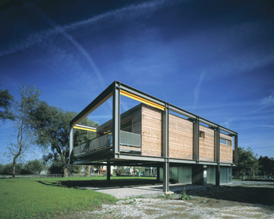 Die pfahlbauartige Aufständerung der geschützten Box ergab sich aus dem Umstand, dass das Grundstück in Bodenseenähe schon einmal (beim Hochwasser 1999) komplett unter Wasser gestanden war und man sich nun gegen die unwirtliche Seite der Natur wappnen wollte.