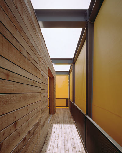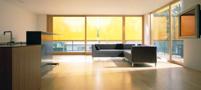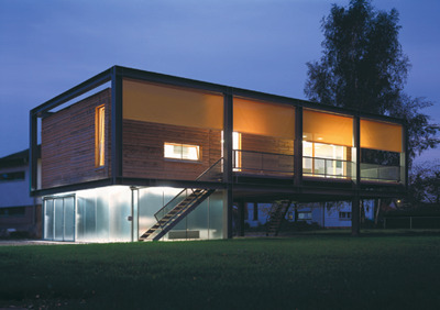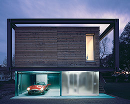 Das zweite in die Stahkstruktur eingefügte Modul besteht aus einer gläsernen Box – die transparente Garage des Hauses mit Nebenräumen und Erschließungszone. Ein massgeschneidertes Refugium, das in intensivem Gedankenaustausch zwischen dem Bauherren und dem Architektenteam in sehr kurzer Zeit entwickelt werden konnte. (Text: Gabriele Kaiser, 10.01.2003)