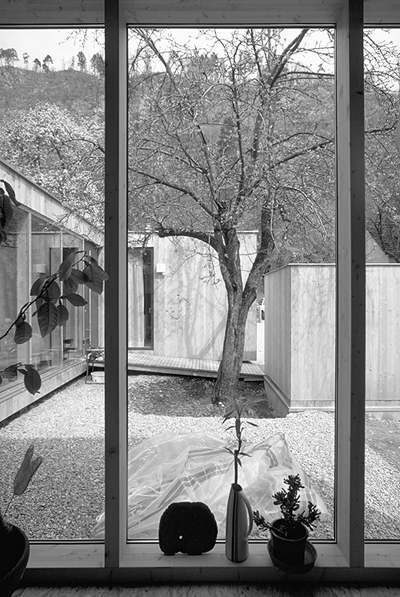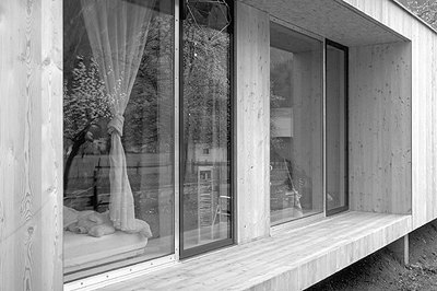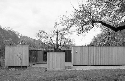 Um den vorgegebenen engen Kostenrahmen keinesfalls zu überschreiten, wurde in Zusammenarbeit mit einer lokalen Holzbaufirma ein möglichst hoher Vorfertigungsgrad angestrebt – und erzielt: die im Werk vorgefertigten Boden-, Wand- und Decken-Module konnten auf der Baustelle nach einem Konstruktionsraster, dem auch die Fensterflächen eingegliedert sind, in effizienter Weise zusammengefügt werden. Die tragenden Wände bestehen aus unbehandelten Lärchenmassivholzplatten mit innenliegender Schafwoll-Wärmedämmung und Gipskatonverkleidung. Decke und Boden wurden aus Sandwich-Elementen aus OSB-Platten gefertigt, wobei innenraumseitig die Oberfläche roh belassen blieb. (Text: Gabriele Kaiser, 30.04.2003)