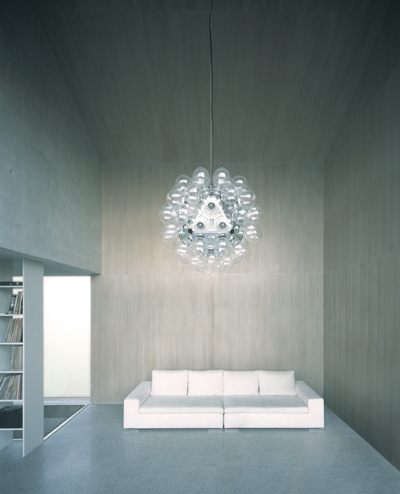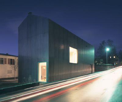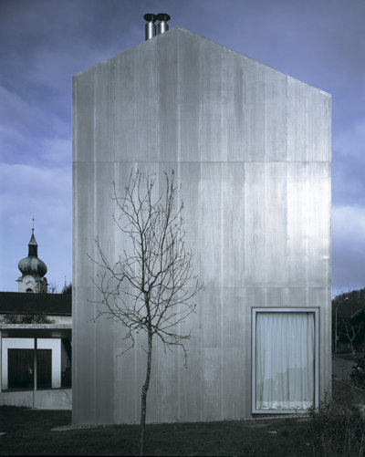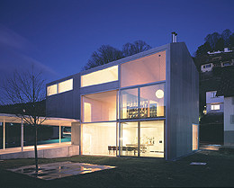 Während sich die monolithische Ostseite, an der auch der Eingang liegt, gegen die Strasse realtiv verschlossen zeigt, ist die privatere Westseite – durch das grosse Vordach für sechs (!) PKWs nordseitig beschirmt – mit grossen Verglasungen (doppelte Hebeschiebeflügel) zur Gänze geöffnet. Die Gliederung der 280 m² Wohnfläche ist präzise entlang den Bedürfnissen des Bauherren (für den der Architekt – damals noch im Team mit Johannes Kaufmann – schon Jahre zuvor eine Bar gestaltet hatte) entwickelt. Im Erdgeschoss ist mit einer von oben belichteten „Traumküche“ und Gästetafel auch für grösseren Besucherandrang vorgesorgt, im Geschoß darüber separiert der Treppenaufgang Homeoffice- und Wohnbereich, von wo man durch ein maschendrahtgesichertes Bodenloch einen Blick auf die Küche werfen kann. Das an der Südspitze des Hauses gelegene Wohnzimmer reicht über zwei Geschoße, Wand- und Giebelflächen bilden hier eine homogene Fläche mit integrierter Schrankwand. Alles perfekt, nirgendwo ein blinder Fleck. Ganz oben sind naturgemäss die Schlafgemächer untergebracht. Ein grosses, zwei kleinere. Den Luxus eines offenen Bades leistet sich, wer sich zu Hause niemals gestört fühlen muss. (Text: Gabriele Kaiser, 14.02.2003)