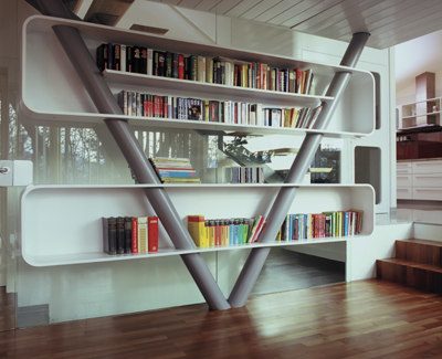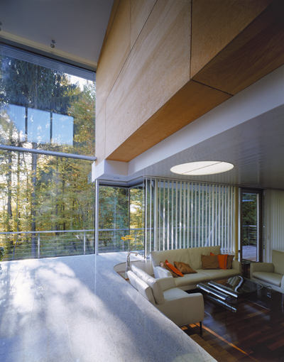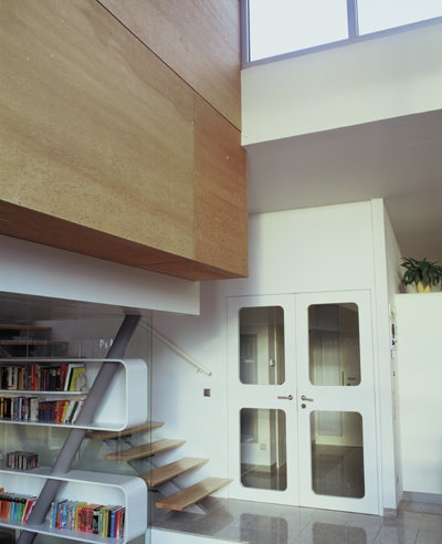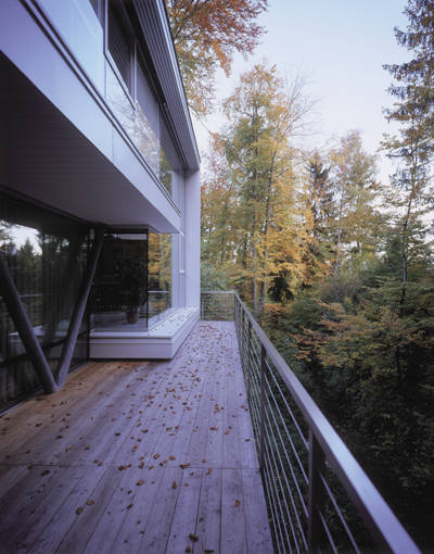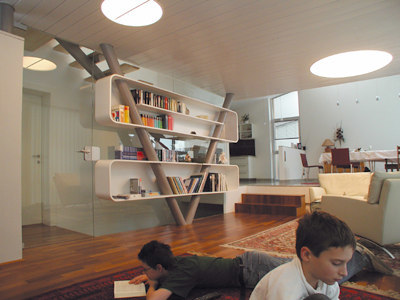 Beim Haus im Bergheim kommen in dieser Hinsicht ja ohnehin die Bäume zu Hilfe. Die Berührungspunkte zwischen Haus und Boden sind sichtlich sparsam gesetzt: Die Box mit den Schlafräumen liegt wie eine Luftbrücke über dem Steilhang, eine Terrasse kragt idyllisch über den Bach. Und da die Stahlstützen auch die Wohnzone „durchkreuzen“, lag es nahe, sie lapidar zu nutzen - etwa als Träger einer Regalschleife. In jedem der Räume ist der Bezug zum Garten, zu Wald und Ausblick ein wichtiger Aspekt. Mit der transluzenten Wärmedämmfassade als zusätzlichen Stimmungsbringer kann man tatsächlich von hautnahem Wohnen in der Natur sprechen. (Text: Gabriele Kaiser)