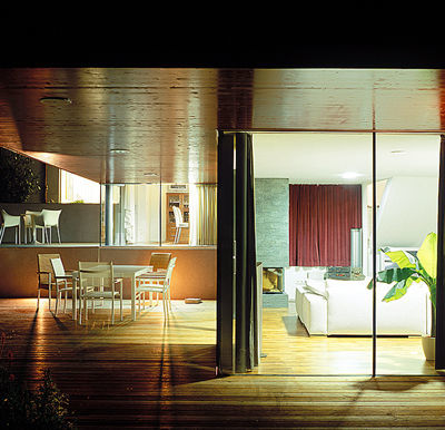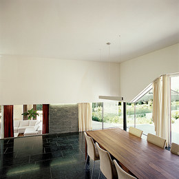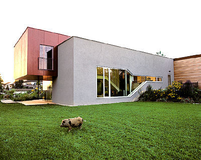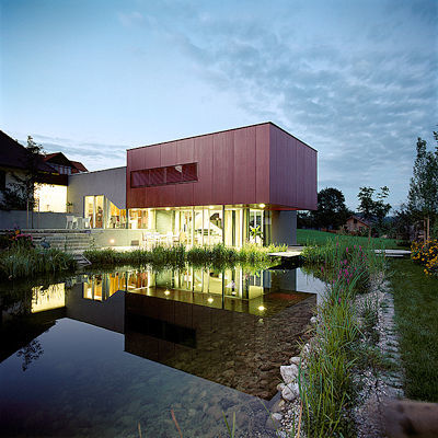 Die Stereometrie des Neubaus, die gesplittete Anordnung der Ebenen, ergibt sich aus den „Höhenschichten“ zum Teich hin, die es ermöglichen, die einzelnen Räume in den Garten hin zu erweitern. Der über dem Teich (natürlich nur zum Schein) schwebende Baukörper des Obergeschosses mit den Schlafräumen der Bauherren ist zum Ausdruck seiner Besonderheit mit roten Lärchenplatten bekleidet. Und: „Die Fassadenöffnungen“, so die Architekten, „sind das geometrische Abbild dieser Höhenbewegung.“ Das freundliche Haus-Tier - von derartigen Beschaffenheiten wenig beeindruckt - suhlt sich indes wohlig im Garten. (Text: Gabriele Kaiser, 13.02.2003)