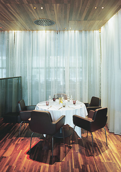 Am Restaurant überrascht zuallererst die ungewohnte räumliche Großzügigkeit. Es heißt zwar, daß sich ein Restaurant dieser Kategorie nicht unter 110 oder 120 Sitzplätzen ökonomisch führen läßt - und die gibt es hier ja auch -, aber der Raum ist trotzdem nicht vollgestellt. Sogar die Logen an der Rückwand sind so dimensioniert, daß zum Nachbartisch reichlich Abstand besteht. Überhaupt ging es ja darum, gleichwertige Plätze zu schaffen. Denn wer geht schon gern gut (und eher teuer) essen, um dann an einem schlechten Tisch zu sitzen.