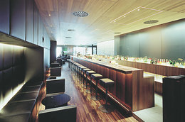 Von diesem Büro, das sich vor allem auf dem Gebiet der Verkaufsketten- und Geschäftsarchitektur (Libro zum Beispiel) verdient gemacht hat, ist man anderes gewöhnt: zumindest eine Materialität, die stärker mit dem Zeitgeist operiert. Nichts - oder fast nichts - davon im „Fabios“. Armin Ebner von BEHF (Projektleitung: Petra Simon) hat hier ganz auf Zeitlosigkeit gesetzt, auf Langlebigkeit und natürlich auf Noblesse. Denn das sollte es schließlich sein: ein großstädtisches Nobellokal, Restaurant und Bar, mit 120 Sitzplätzen und einem Ambiente, das als Bühnenbild für den Auftritt einer gehobenen Klientel funktioniert.