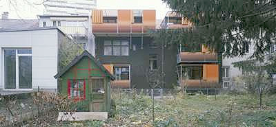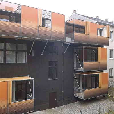 Angesichts der Hoffassade ihres jüngsten Projektes denkt man unweigerlich an die Siebziger: Vorgehängte Balkone erweitern die Wohnungen um einen luftigen Freiraum. Zum Sicht- und Sonnenschutz sind sie mit textilen Membranen bespannt und gedeckt. Farben und Muster (Braun und kräftiges Orange) wirken ganz schön retro und liegen voll im Trend. Einen stilisierten Sonnenuntergang sehen die Architekten im grafischen Muster der Brüstungsabdeckungen. Ein bewegliches Element kann wie ein Vorhang zur Seite geschoben werden, um den Öffnungsgrad individuell zu steuern. Die Textilflächen sind mit Ösen und Seilen an der Balkonkonstruktion befestigt und lassen sich daher leicht austauschen. Technisch betrachtet handelt es sich bei den vorgehängten Stahlkonstruktionen mit Holzboden um Balkone. Der Sonnen- und Sichtschutz verleiht ihnen allerdings die Qualität einer Loggia.