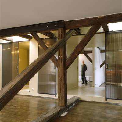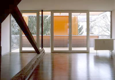 Erschließungsflächen wurden minimiert und mit anderen Nutzungen gekoppelt. Im Wohnungskern sind in Einbauten alle dienenden Funktionen wie Sanitärräume konzentriert. Je nach Wohnung lassen sich Durchgangsbereiche in diesen Zonen mittels variabler Stellung der Türflügel auch dem Nassbereich zuschlagen. Oder es gibt Schiebetüren aus transluzenten Doppelstegplatten zum Trennen und Verbinden von Wohnungshälften. Über den Kernzonen dienen Hochebenen in den Dachwohnungen als Liegeflächen oder Stauraum.