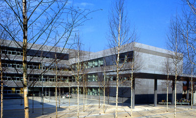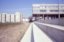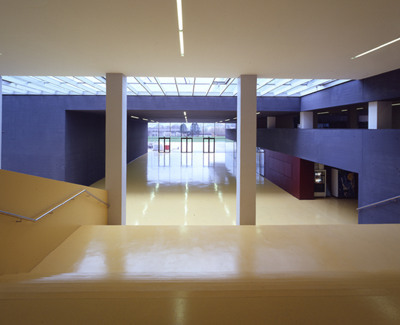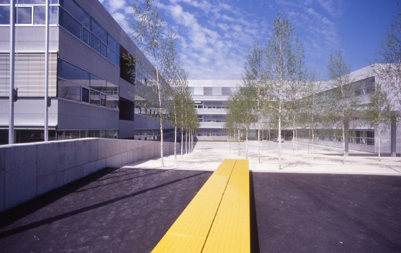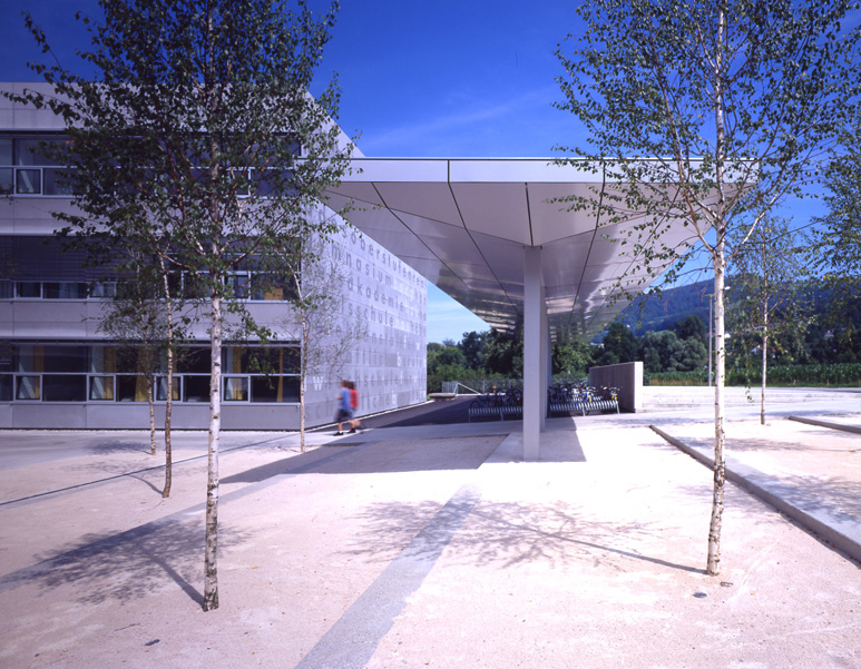 Ziel der Planung war es, die beiden Schulkompelxe zu entflechten und terrassenförmig vorgelagert einen polyvalenten gemeinsamen Raum (Aula, Speisesaal, Bibliothek etc.) zu entwickeln. Es galt, das umfangreiche Raumprogramm schlüssig in Bestand und Neubautrakten in einer Weise zu organisieren, die Orientierung und Eigenidentität begünstigt und doch die Einbindung „ins grosse Ganze“ (repräsentiert durch eine riesige Aula) ermöglicht. Das vorhandene stukturelle Konzept wurde akzeptiert, punktuell durchbrochen und weiterentwickelt. Man muss bedenken, dass in dem Gefüge mit seinen teilweise schwebenden und die Schulhöfe begrenzenden Flügeln mehr als 50 Klassen untergebracht sind sowie diverse Sondersäle, zwei hauseigene Turnsäle und eine Grossküche. Durch die Auflösung in jeweils über Mittelflure erschlossene und windradartig umbrochene Trakte sind die einzelnen Schulen in klar überschaubare Einheiten strukturiert. Durch die Einkleidung der Baukörper mit grossflächigem Eternit und eine forcierte horizontale Bänderung wird die ursprüngliche Massivität der Kubaturen relativiert.