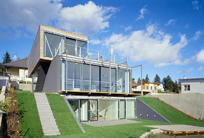 Ein Steilhang mitten in einer Einfamilienhaussiedlung in Klosterneuburg und der Wunsch nach einem großzügigen, modernen Wohnhaus waren vorhanden. Um dazu die geeigneten Architekten zu finden, hat man unter drei Favoriten einen kleinen Wettbewerb veranstaltet.