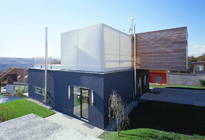 Erst vom Garten aus erklärt sich die grundsätzliche Konzeption. Die beiden unteren Geschoße sind in Massivbau ausgeführt. Die seitlichen Betonwände des Kellers greifen in den Garten, das natürliche Gelände begleitend, aus und bilden schützende Flanken für die Terrasse. Nach oben hin wird die Materialbeschaffenheit und damit die Wirkung leichter. Denn auf zwei Vollgeschoßen liegt als schmaler Balken eine holzverkleidete Box auf.
