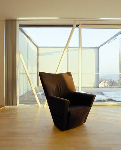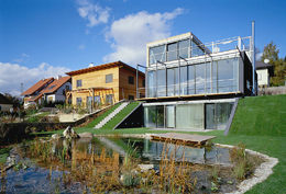 Schlafzimmer und Bad liegen unten, weil es hier am kühlsten ist. Sie haben direkten Zugang in den Garten und zum Badeteich, der mit der Hangkante endet und so die Aussicht auch beim Schwimmen voll genießen lässt. In den teils im Erdreich gelegenen Räumen liegen eine Vinothek und der Fitnessbereich. Für Ferienfeeling sorgt der leichte Dachaufbau mit zweiseitiger, Raum-hoher Verglasung zur Terrasse hin. Um trotz der Exponiertheit sowohl Innen- als auch Außenraum einen Höchstgrad an Privatheit zu verleihen, wurde an der Terrassenbrüstung ein Paravent-artiger Sichtschutz angebracht.