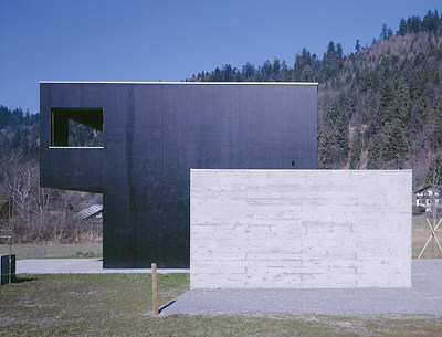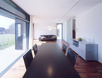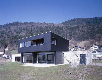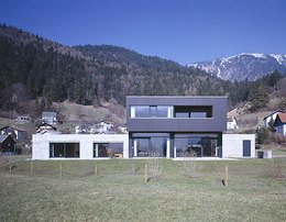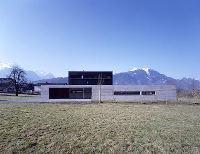 Präsentiert sich die nach Norden orientierte Zugangsseite gegen die nachbarschaftliche Hangverbauung als eher verschlossen, fast abweisend, ermöglichen die großzügigen südseitigen Öffnungen der Arbeits – und Wohnbereiche weitschweifende Ausblicke vom Walgau bis zu den Bergen im Montafon. Der Genuss der Aussicht, die Möglichkeit des Rückzugs und die Benützung der diversen Außenbereiche soll erholsames Wohnen ermöglichen und zu frohem Schaffen animieren. (Text: Architekt, 25.06.2003)