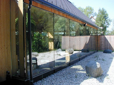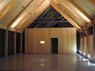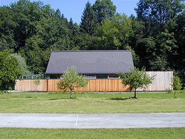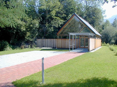 Der Baukörper, ein Holzskelettbau auf Betonfundamenten mit Holzriegel-Aussenwänden und einem Satteldach mit einem Leimbinderfachwerk, birgt die Aufbahrungs- und Zeremonienhalle samt Aufenthaltsraum und den Nebenräumen. Die Holzbinderkonstruktion besteht aus zart unterspannten Leimbinderrahmen, die Wände sind beiderseits mit Dreischichtplatten verkleidet. Durch die verglaste Giebel-Stirn und über die Steingarten-Seite flutet Tageslicht in den Raum, im abgedunkelten Zustand wird dieser zum geschützten Gedenk-Ort. (Text: Gabriele Kaiser, 08.05.2003)