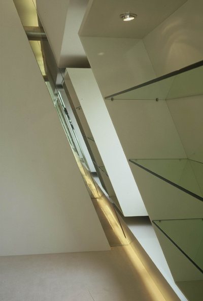 In der gleichen Höhe wie die Bank im Wohnraum schwebt konsequenter Weise die in Stein eingelassene Wanne im Badezimmer oder ein Ladenschrank im Schlafzimmer. Trennwände und raumhohe Türen sind fein säuberlich durch Schattenfugen oder vertikale Spiegelstreifen abgesetzt, und scheinen im Raum zu schweben. Integrierte Leuchtstoffröhren als allgemeine Raumbeleuchtung bilden warm getönte Lichtlinien, die den Schwebeeffekt unterstützen und zusätzlich dynamisierend wirken.