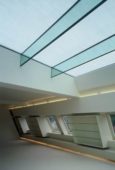 Das von Überflüssigem befreite Volumen kleideten sie mit einer neuen Schicht aus. Sie entschärft nicht nur die Schräge der Dachneigung, sondern übernimmt auch etliche funktionelle Aufgaben, wie Sitzbank oder Stauraum. Die horizontalen Hauptlinien ziehen sich ohne Unterbrechung durch die ganze Wohnung und vereinen die einzelnen Bereiche zu einem fließenden Raumkontinuum von erfrischender Dynamik.
