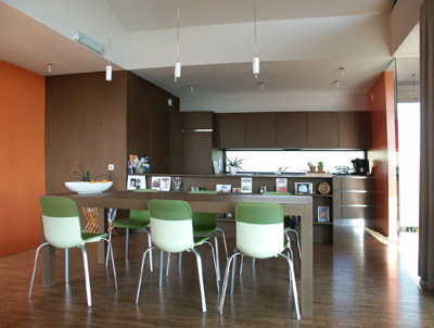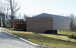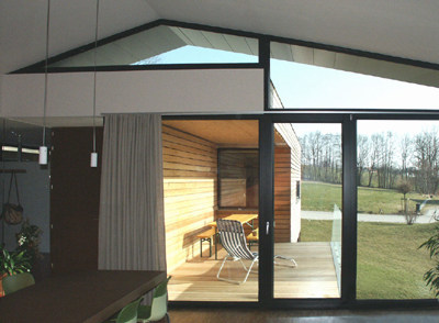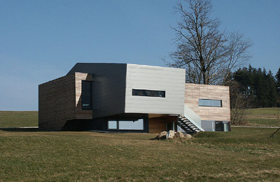 In Einklang mit den landschaftlichen Reizen des Alpenvorlands wird das Passivhaus auf der oberen Ebene betreten, das Satteldach öffnet sich breitgestreckt nach Süden. Im auskragenden Obergeschoss wird gewohnt, gekocht und gegessen, unten liegen die elterlichen Schlaf- und Nebenräume. Der mit einem Satteldach gedeckte Baukörper wurde mit Domico Planum-Tafeln bekleidet, der flach gedeckte Baukörper mit einer Schalung aus Lärchenholz. Dem Architekten war es ein Anliegen, den Bezug des Hauses zum Umraum möglichst differenziert zu gestalten: „Das Haus lässt von aussen seine Beziehung zum landschaftlichen Raum kaum erahnen, von innen entwickelt es einen unerschöpflichen reichtum an Ausblicken, ohne die Natur zu nahe heranzulassen.“ (Text: Gabriele Kaiser, 09.5.2003)