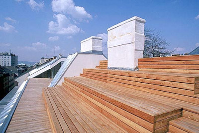 Die neue Dachlandschaft ist ein Erlebnis für sich. Mit Sitzstufen, wie Skulpturen herausragenden Nebenräumen für Griller, Liegestühle und alles andere, was den Aufenthalt unterm weiten Himmel zum Luxus macht, ist sie abwechslungsreich über zwei Terrassenebenen gestaltet. Mit jedem Höhenmeter gewinnt der Ausblick, ganz oben weitet er sich auf die Karlskirchenkuppel und ein Panorama aus Gaupen, Einschnitten, Ziegel und Flachdächern.