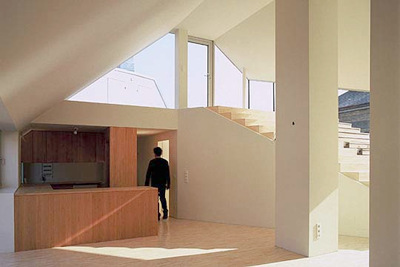 Die Bauherrenwohnung schließt an die erste an. Rechts beim Eingang sitzt die Küche als quadratischer Block, der Blick schweift zwischen Spüle und Oberkastenzeile in den beidseitig verglasten offenen, hellen Wohnraum dahinter. Als einzig raumtrennende Elemente ragen die verputzten Kamine wie Pfeiler in die Decke, die auf fünf Meter ansteigt. Eine spektakuläre, schräg geschnittene Innenstiege führt an der offenen Glaswand im Westen auf die Terrasse. Bei freiem Blick über Wiens Fassaden kann man parallel zur Außentreppe auf die zweite Dachebene gehen oder dort Platz nehmen, um das Panorama zu genießen. Im Norden ist noch ein Zimmer mit Oberlicht. Gegenüber der Küche reihen sich an der verglasten Westseite Kinder- und Elternschlafzimmer aneinander, alle mit Türen ins Freie, im Osten liegen Abstell- und Schrankraum, WC und Bad mit Terrassenzugang.