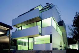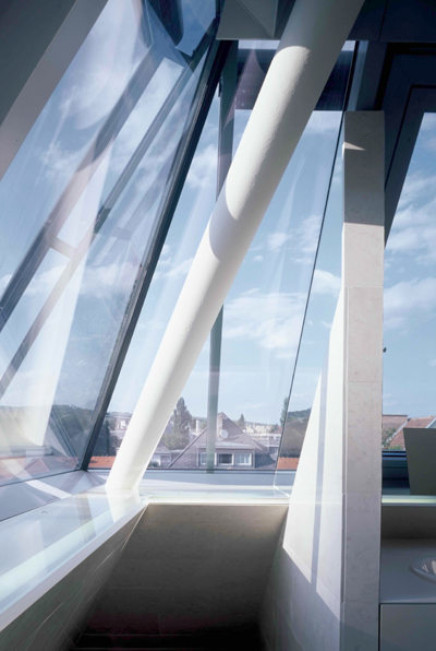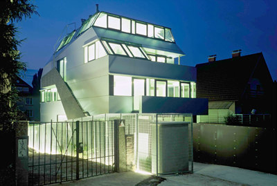 Dynamisch schließen Dachgaupen das Gebäude ab. Eine extreme Herausforderung an die technische Machbarkeit war deren Verglasung am Eck, wo drei polygonale Scheiben zum offenen Himmelsblick zusammentreffen. Das Haus ist ein Stahlbetonskelettbau mit vorfabrizierten Wandpaneelen aus Holz, bei den Fensterparapeten zeigt sich die Konstruktion in schlanken Stahlsäulen. Licht unter Mattglas lässt sie nachts zum entgrenzenden Leuchtband werden, indirekt bestrahlt wird auch der Gartenzaun, was dem Bau ein faszinierendes Nachtgesicht verleiht.