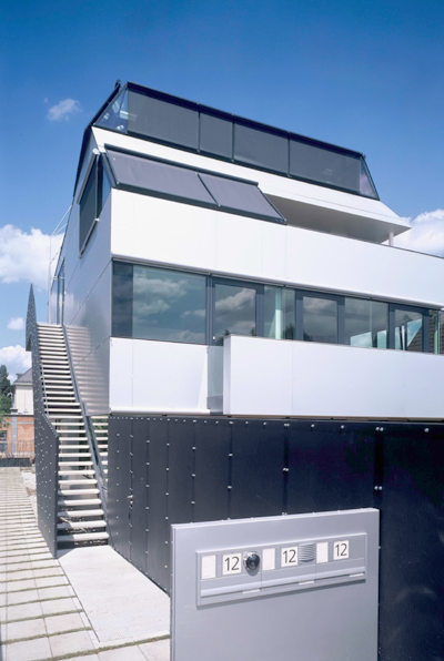 MARTERERMOOSMANN machten aus der Not eine Tugend. Raffiniert meißelten sie aus der neuen, vierstöckigen, bauordnungsgemäßen Kubatur einen facettenreichen Hausmonolithen von kühler Eleganz. Fast stromlinienförmig glatt wirkt die hinterlüftete Außenhaut aus eloxiertem Aluminium mit weitläufigen Fensterbändern. Die Parapethöhen sitzen so, dass Metall und Glas an der Fassade zwei gleich hohe Streifen bilden. Eingeschnittene Loggien geben der Straßenfront plastische Tiefe, gartenseitig treten die Balkone mit vorderen Alu und seitlichen Glasbrüstungen als flächige Scheiben aus der Fassade.