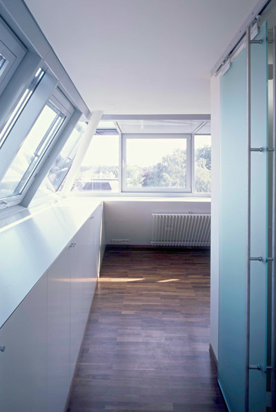 Vierseitig von Fensterbändern umgeben, herrscht in den Wohnungen mit über 2,70 Meter Höhe lichtdurchflutete Weite. Am Eingang ist komprimiert der Sanitärblock, Sanitärblock, die restliche Ebene dient im offenen Einraum mit weiter Nord- und Südterrasse dem Wohnen. Die mittige, transparente Innenstiege führt in die zweite Etage zu den Schlafräumen mit je einem Bad. Eingehaust von einer Nurglasfassade wurde die alte Garage mit begrüntem Flachdach zum japanisch anmutenden Gästehaus.