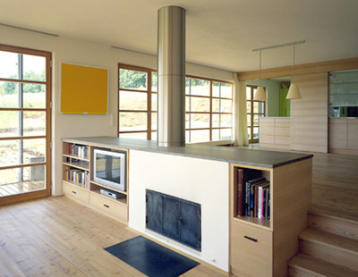Das „Dachstuhl“-Geschoß ist der ideale Ort für die Kinderzimmer, die dank eines zusätzlichen „Spielgangs“ grösste Bewegungsfreiheit gewähren. Elternschlafzimmer und Gästezimmer liegen im oberen, kleineren Bauteil, die öffentlichen Räume wie Küche, Essplatz und Wohnraum, ineinander übergehend, im unteren, größeren Bereich. Im obersten Dachkammerl befindet sich über den Bädern als entlegenstes Rückzugsgebiet ein kontemplativer Meditationsraum mit Oberlicht. In der klaren Volumetrie des Gebäudes sind die Irregularitäten der Nutzung – erkennbar an den ungleichartigen Fensteröffnungen in Wand und Dachflächen – sinnfällig eingeschrieben. (Text: Gabriele Kaiser, 20.06.2003)