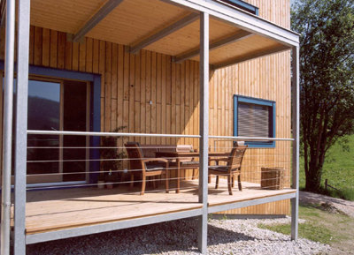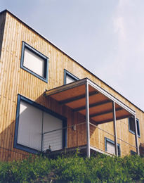 Die statische Grundkonstruktion bildet ein Stützen- Deckensystem (Ortbeton). Die Fassade mit Passivhausstandard wurde komplett in Holzleichtbauweise vorgefertigt. Die Aussenwände sind statisch nicht beansprucht, weshalb sich der Holzanteil auf ein Minimum reduzieren lässt. Die Energie- und Kosteneffizienz kann dadurch auf ein Maximum gesteigert werden. Sämtliche Innenwände sind statisch nicht belastet, wodurch sich eine hohe Flexibliltät der Grundrissgestaltung ergibt. Als Fassade kamen unbehandelte, rohe Fichtenbretter zum Einsatz. Auf ein Vordach wurde bewusst verzichtet damit die Fassade gleichmässig abwittern kann. (Text: Architekten, 1.08.2003)