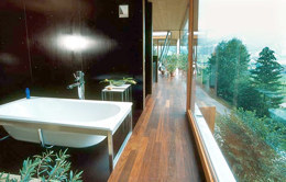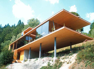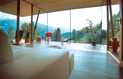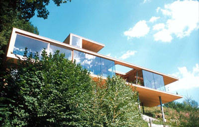 Die siebenfach verleimten KLH-Platten für Decken und Wandscheiben im Treppenhausbereich wurden ohne Oberflächenbehandlung eingebaut, die übrigen Wände bestehen aus einer vorgefertigten Riegelkonstruktion, die Außenschalung aus geölter Lärche. Die schlanke und pure Struktur mit großen Glasflächen und Schiebetüren ist wie ein provisorisches Gerüst in die Landschaft gebettet, – dass es sich darin dauerhaft gut leben lässt, steht außer Zweifel. (Text: Gabriele Kaiser)